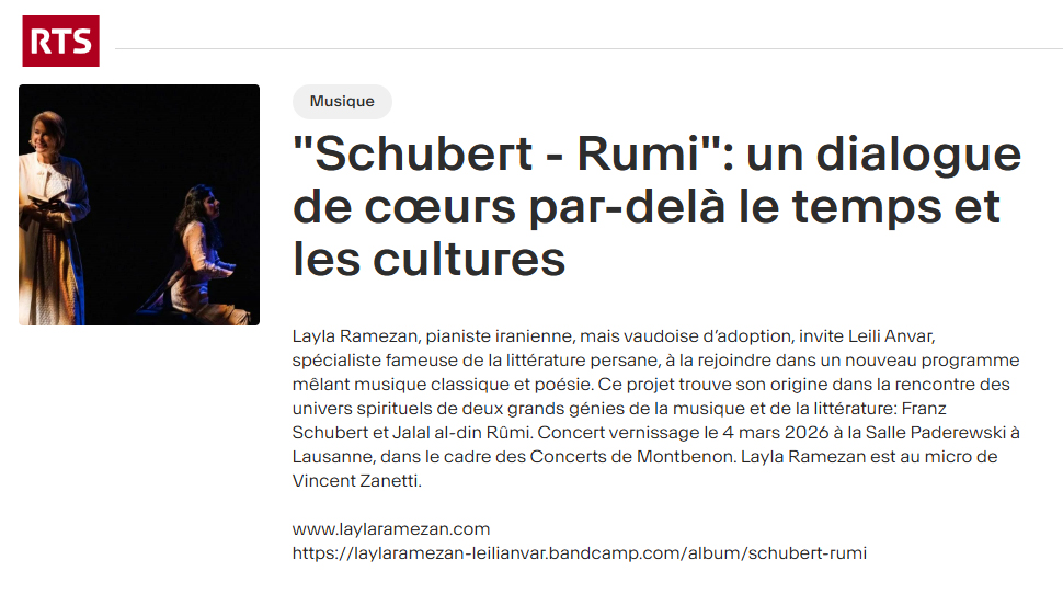 Lausanne Dans la série des Concerts de Montbenon, Leyla Ramezan vient présenter le programme très original de son nouveau disque «Schubert-Rûmi» (TAC/Classics). La pianiste d’origine iranienne met en dialogue la musique de Franz Schubert pour piano avec les vers de Rûmi, poète persan du XIIIᵉ siècle, dits en français et en persan par Leili Anvar. Spécialiste reconnue de la poésie persane et voix emblématique de France Culture, la récitante et traductrice prête sa voix à cette traversée entre musique et poésie, Orient et Occident, intériorité et lumière. Comme le dit la pianiste, «Là où Schubert le Wanderer, erre dans le monde, le mystique Rumi se perd dans le divin. Mais cette différence n’est qu’apparente. Car tous deux cherchent la même chose: un lieu où l’âme cesse d’être étrangère à elle-même». (MCH)
